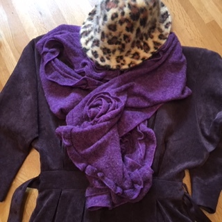 もう一つは、喜寿の後も応用できるように紫の補色、ベージュのヒョウ柄とのコーディネートを提案。